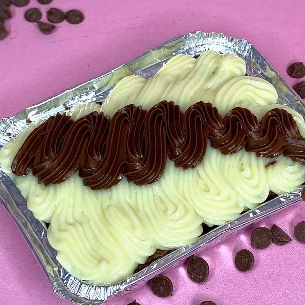Brownie com gotas de chocolate com cobertura de Ninho e creme de avelã, tamanho da embalagem ( marmita de alumínio) comprimento 12.5 , largura 9.5 altura 2 cm , peso aproximado 200g , serve 1 pessoa.
