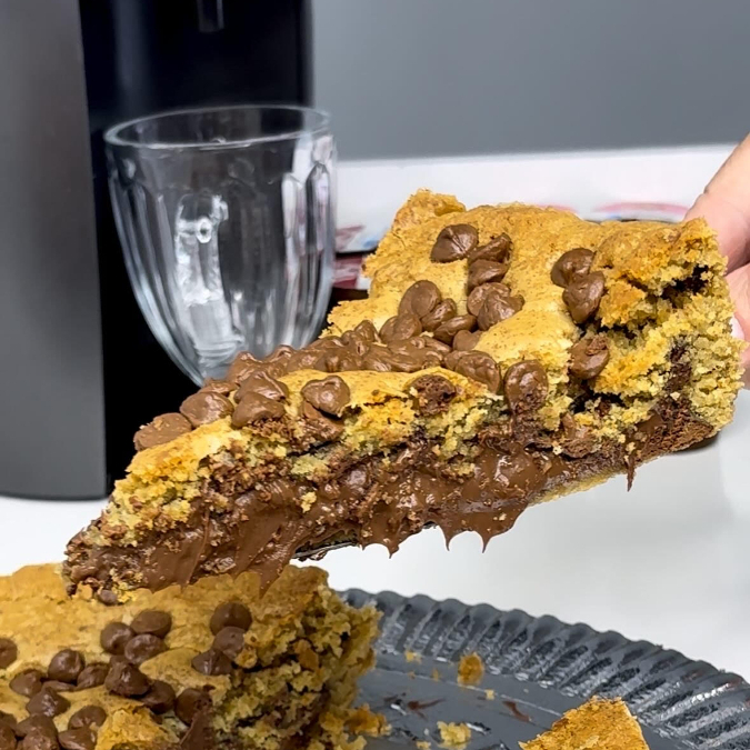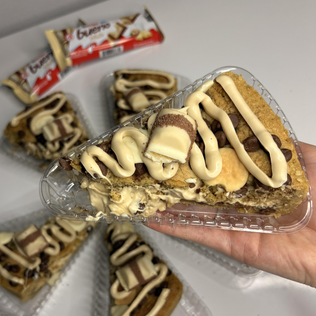 Fatia cookies com gotas de chocolate crocante com recheio macio e suave finalizado com Kinder Bueno. Aqueça por 30 segundos no microondas para que o creme fique ainda mais macio.
