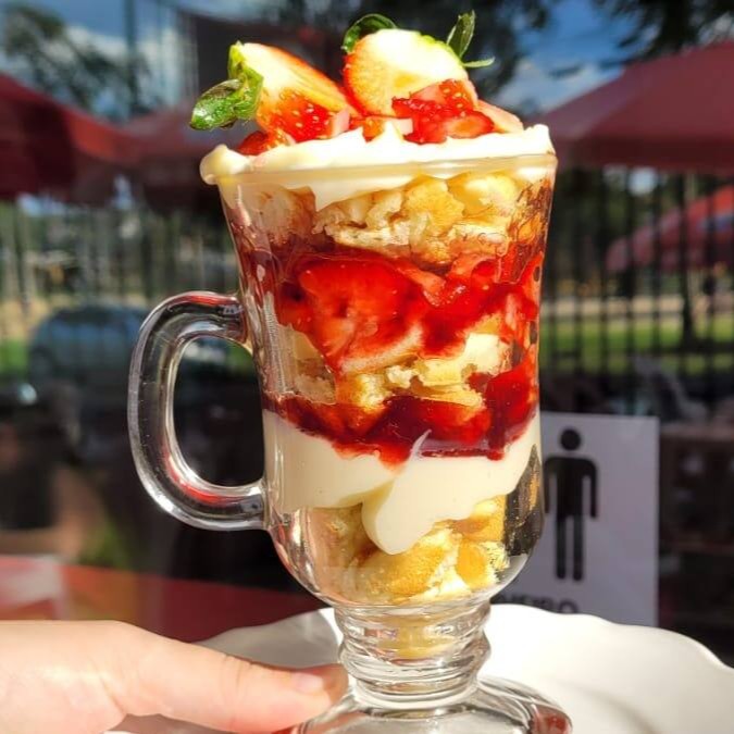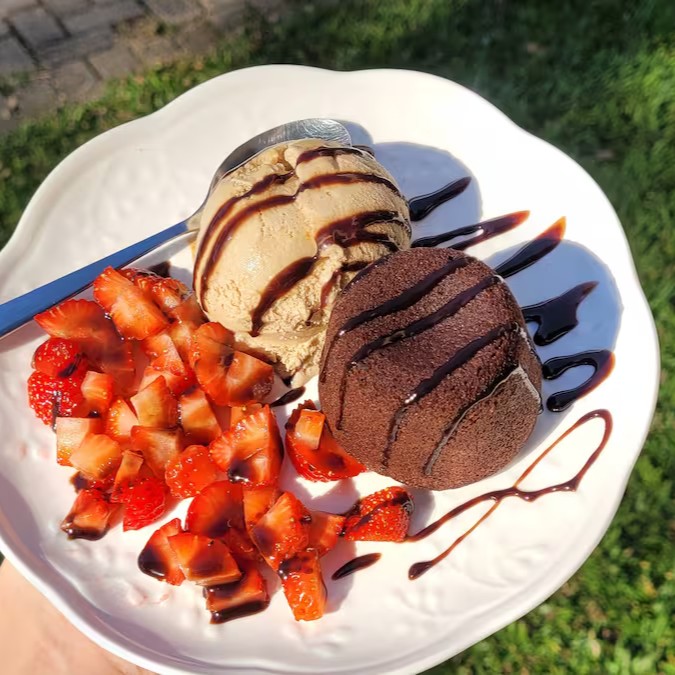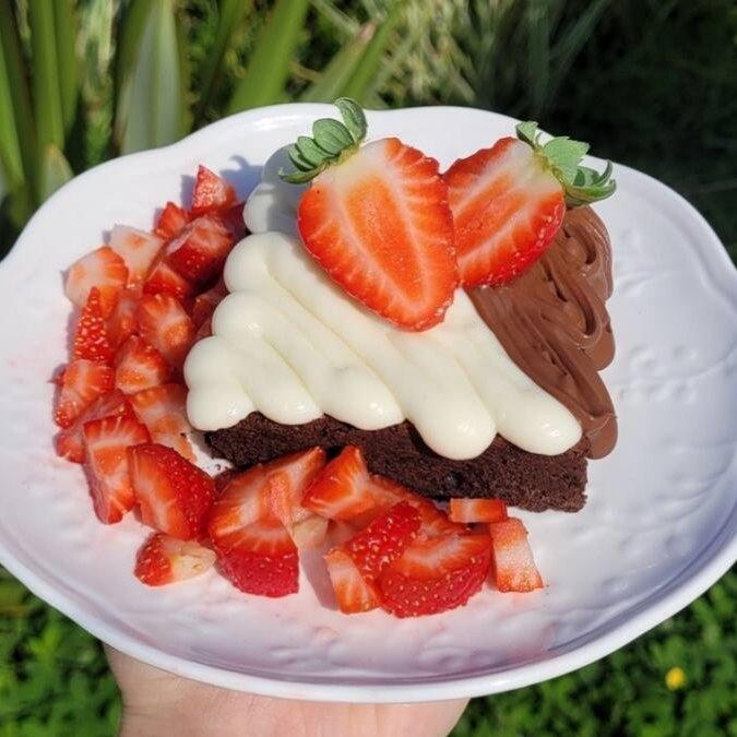 Uma fatia generosa de brownie artesanal feito com chocolate 70% cacau, servido com morangos fresquinhos e, por cima, o creme de sua preferencia!