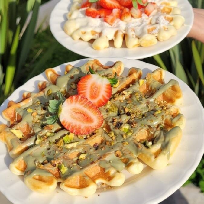 Copo com pedaços de wafles super fofinhos cobertos com recheios e frutas à sua escolha