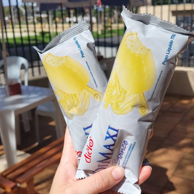 Picolé sabor chocolate branco com cobertura de chocolate branco