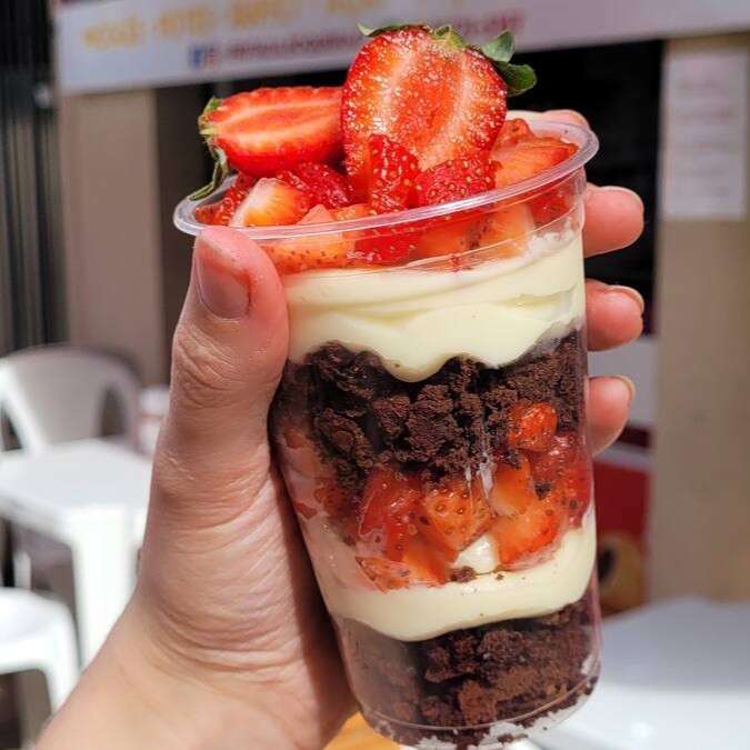 Pedaços de brownie 70% cacau servidos no copo 300ml com brigadeiro e morango