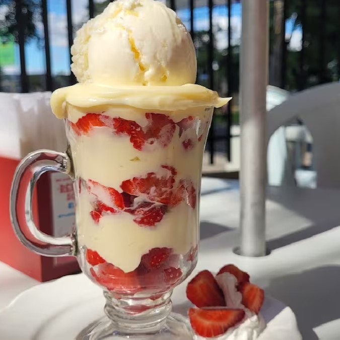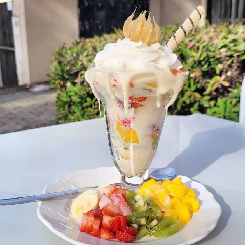 Copo recheado com brigadeiro branco especial, muita fruta e uma bola de sorvete servido no Copo 300ml