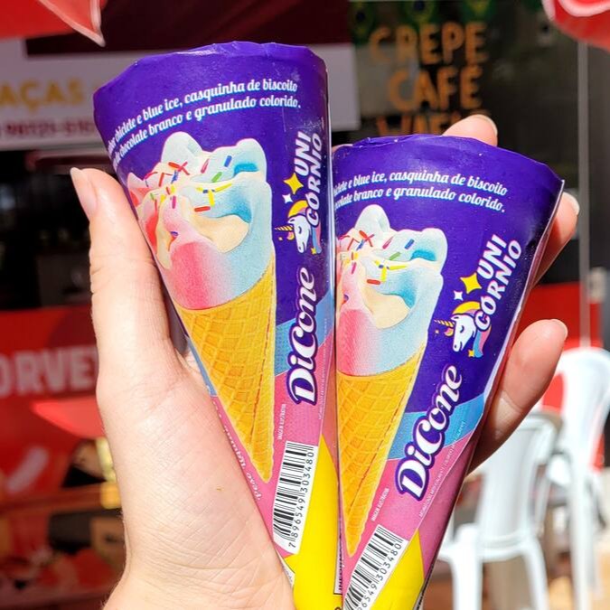 Sorvete sabor chicletes e blue ice, casquinha de biscoito recheio chocolate branco e granulado colorido.