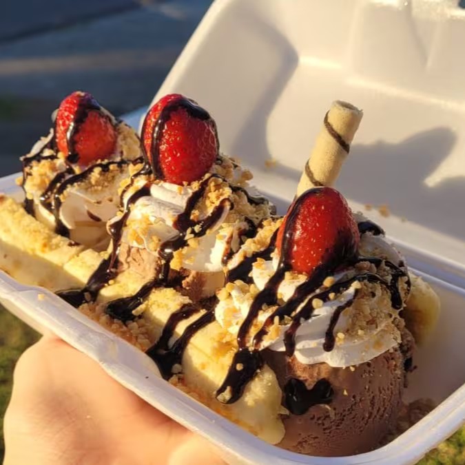 Banana com 3 bolas de sorvete à escolha, amendoim, cobertura, chantilly e morangos.
