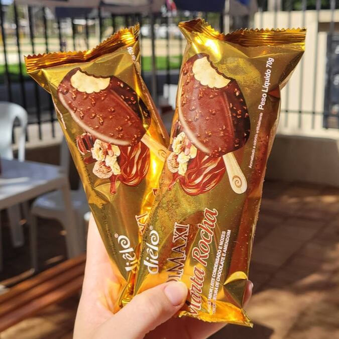 Picolé sabor chocolate e doce de leite com cobertura de chocolate e grnulado sabor chocolate