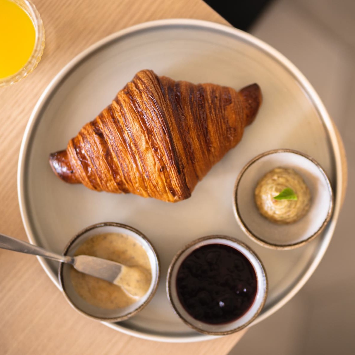 O croissant tradicional da Noni acompanhado de manteiga noisette, geleia e rillete de porco, tudo feito na casa!