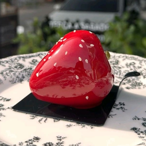 A nossa versão do famoso morango do amor! Uma ganache de morango recheada com compota de morango, finalizado com uma glassagem espelhada. <3
