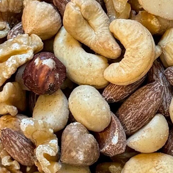 Produto vendido a granel em medidas de 100g. Ingredientes: avelã, castanha de caju, amêndoa salgada, macadâmia e nozes.
