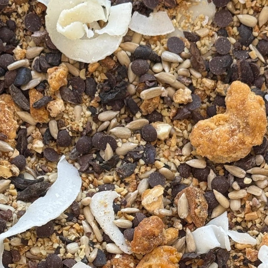 Produto vendido a granel em medidas de 100g. Ingredientes: castanha de caju, pepita de girassol, nibs de cacau, fitas de coco, castanha de caju caramelizada e gotas de chocolate meio amargo.