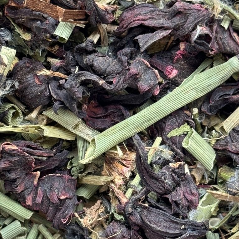 Produto vendido a granel em medidas de 50g. Ingredientes: hibisco, cavalinha e dente-de-leão.