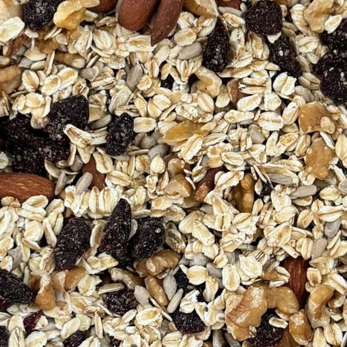 Produto vendido a granel em medidas de 100g. Ingredientes: aveia flocos grossos, cranberry, nozes, amêndoa, pepita de girassol e chia.