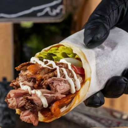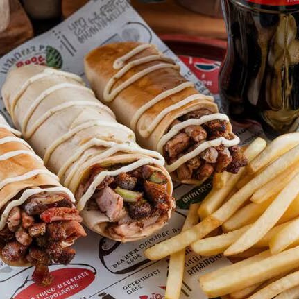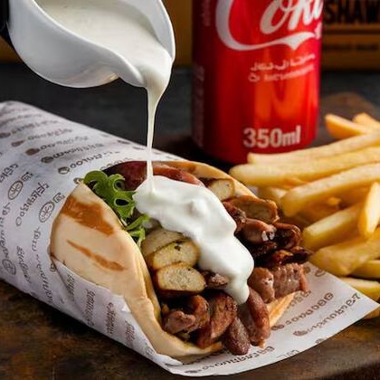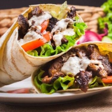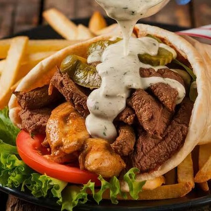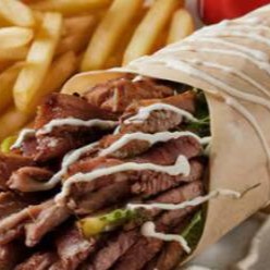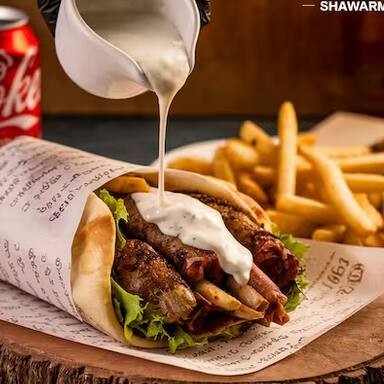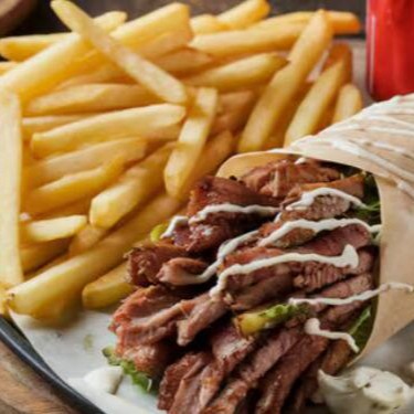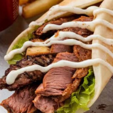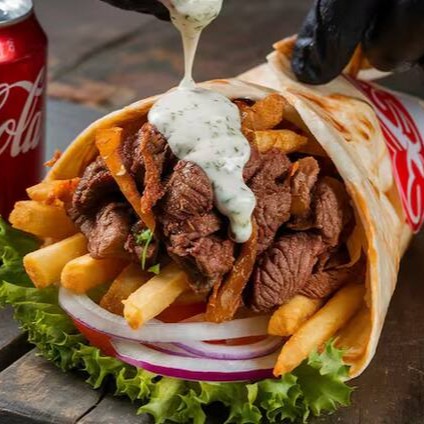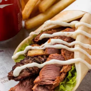 acompanha fatias finas de carne bovina e de frango, alface americana , tomate ,cebola , creme de alho , batatá frita e saboroso molho de tahine, tudo envolvido por um pão sírio de massa fina, finalizado na chapa.