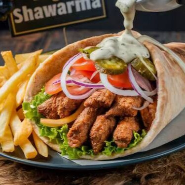 Deliciosa fatias finas de frango alface americana , tomate ,cebola , creme de alho , batata frita e saboroso molho de tahine, tudo envolvido por um pão sírio de massa fina , finalizado na chapa