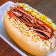 Pao de hot'dog , 1 salsicha, maionese , tomate, milho, batata palha , bacon,