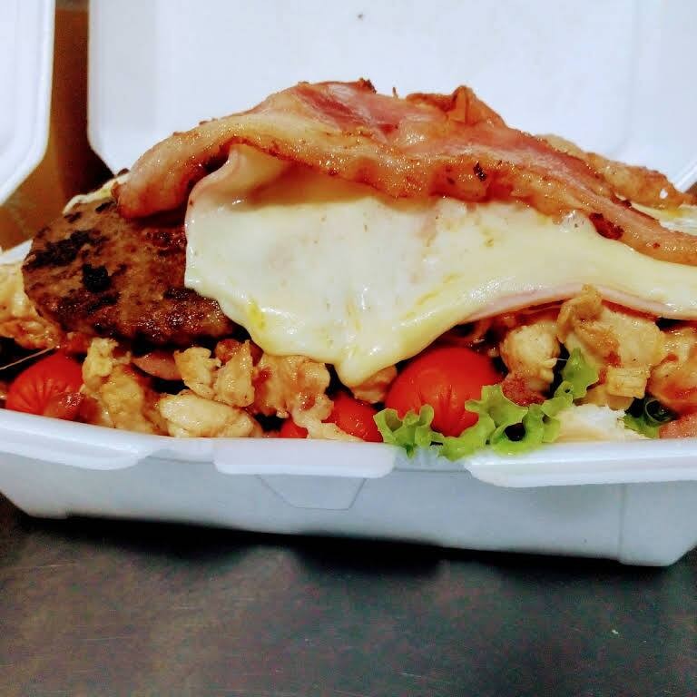 Pão, maionese, 2 hambúrguer de 56gr , 2 ovos, 2 queijo, 2 presunto , frango, calabresa, bacon, tomate, milho, alface, batata palha cheddar e Catupiry