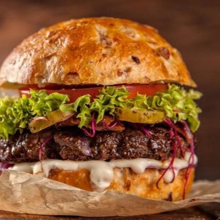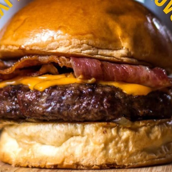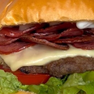 Um delicioso pão de brioche , hambúrguer,90gr Maionese da casa , alface americana , tomate , queijo cheddar derretido, Bacon.