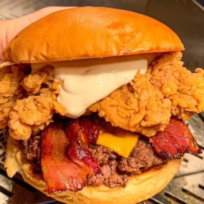 Uma combinação magnifica onde é difícil resistir essa delicia pão macio , 1 ticken empanado 1 hamburguer de 120 gramas de carne macia , bacon maionese da casa , tomate , alface americana