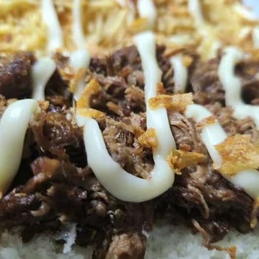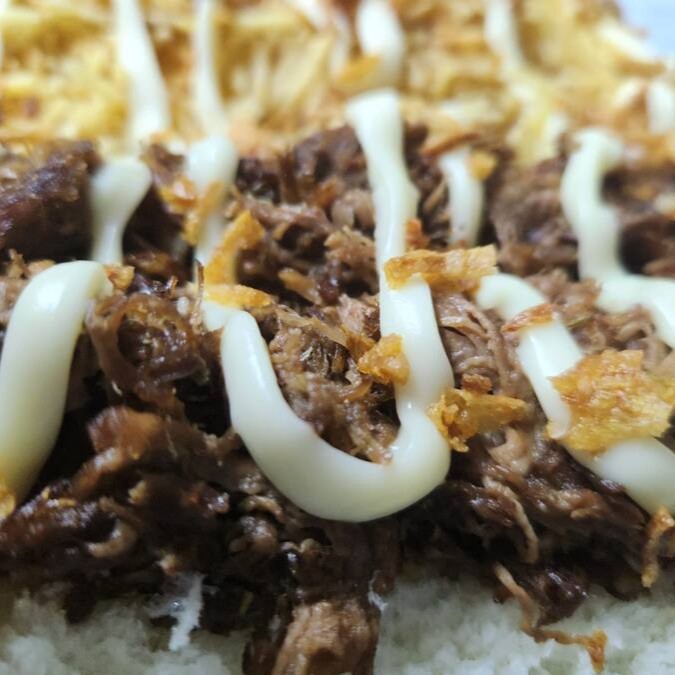 Pão prensado, vina, maionese, deliciosa costela desfiada e temperada, cebola crispy, batata palha e uma opção de queijo a sua escolha.