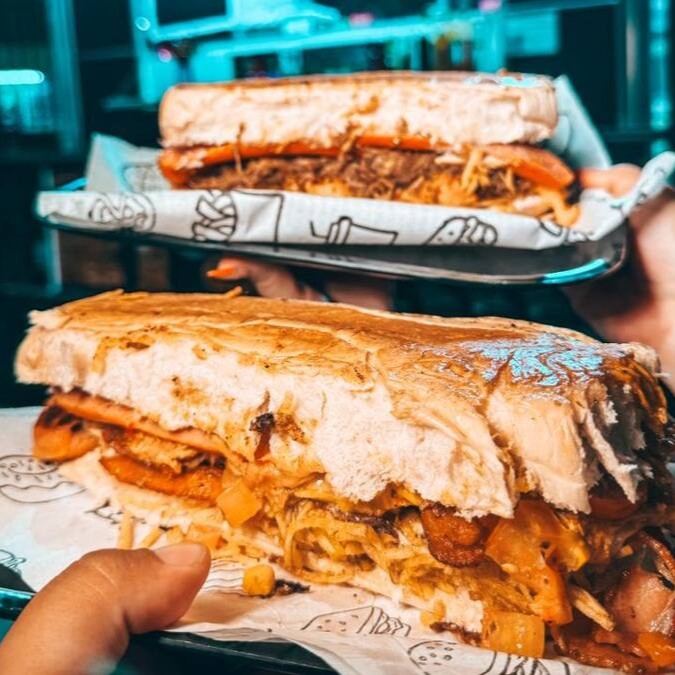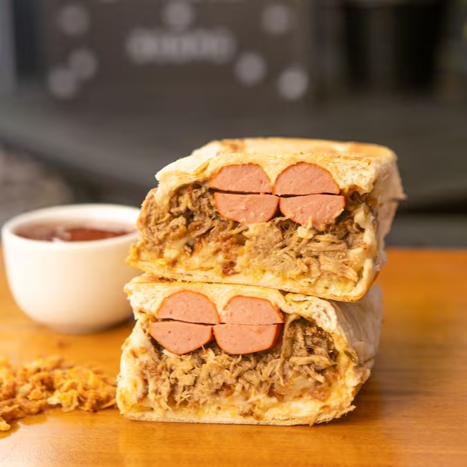 Pão prensado, vina, lombo suíno desfiado, opção de molho a sua escolha, opção de queijo a sua escolha, cebola crispy e batata palha.