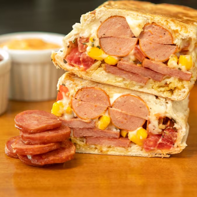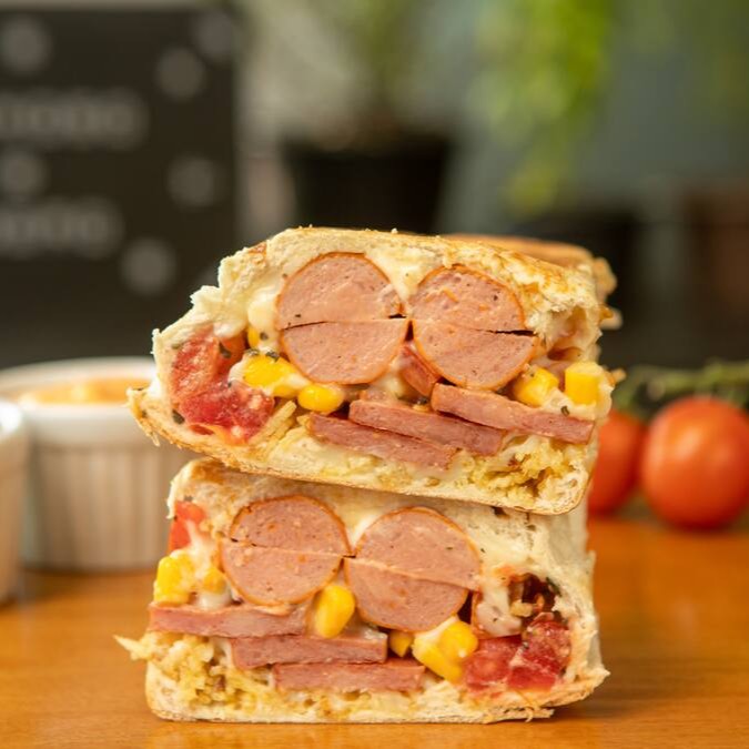 Prensado de pão, 2 vinas, muita calabresa, maionese, vinagrete de tomate, milho, batata palha e uma opção de queijo a sua escolha.