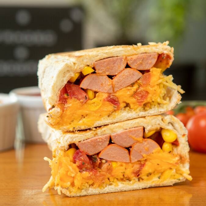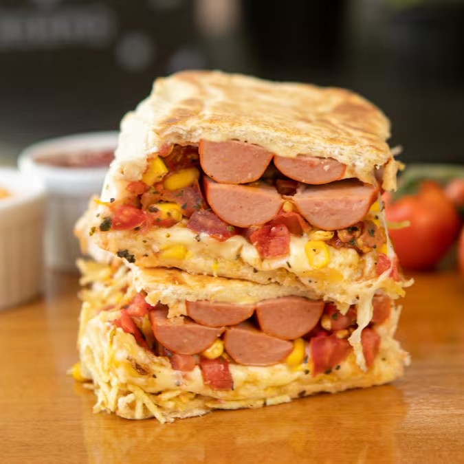 Pão prensado, vina, maionese, calabresa, milho, vinagrete de tomate, batata palha e uma opção de queijo a sua escolha.