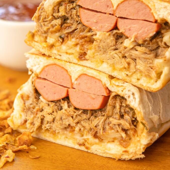 Prensado de pão, 2 vinas, lombo suíno desfiado, maionese, barbecue ou geléia de pimenta ou cebola crispy e batata palha.