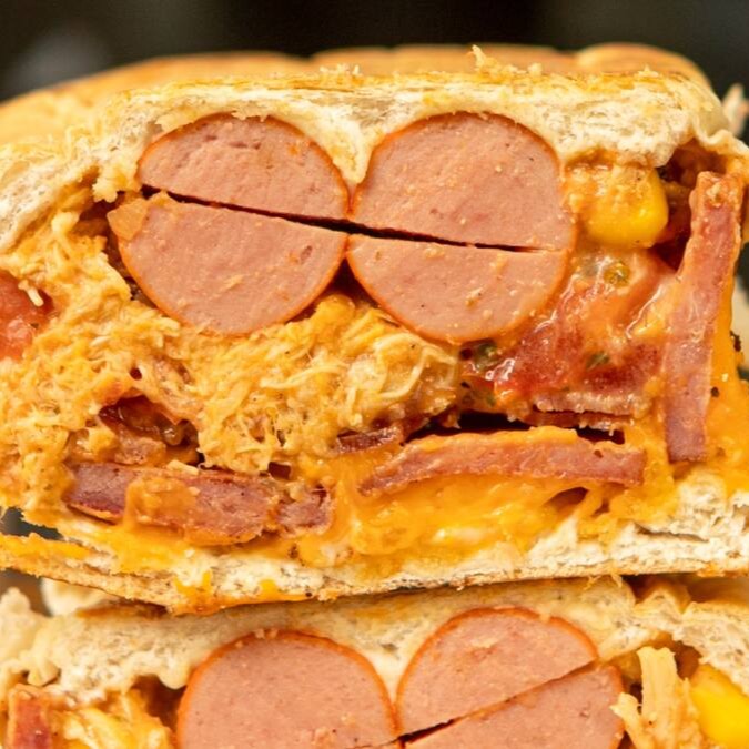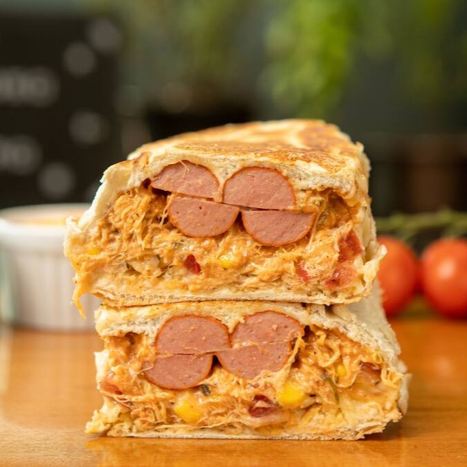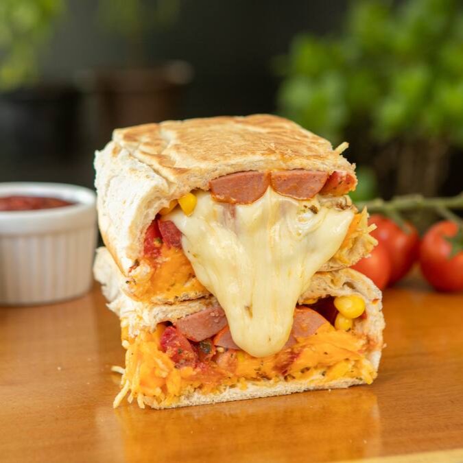 Prensado de pão 20cm, 2 vinas, frango cremoso, bacon, calabresa, milho, vinagrete de tomate, batata palha, maionese e uma opção de queijo a sua escolha.