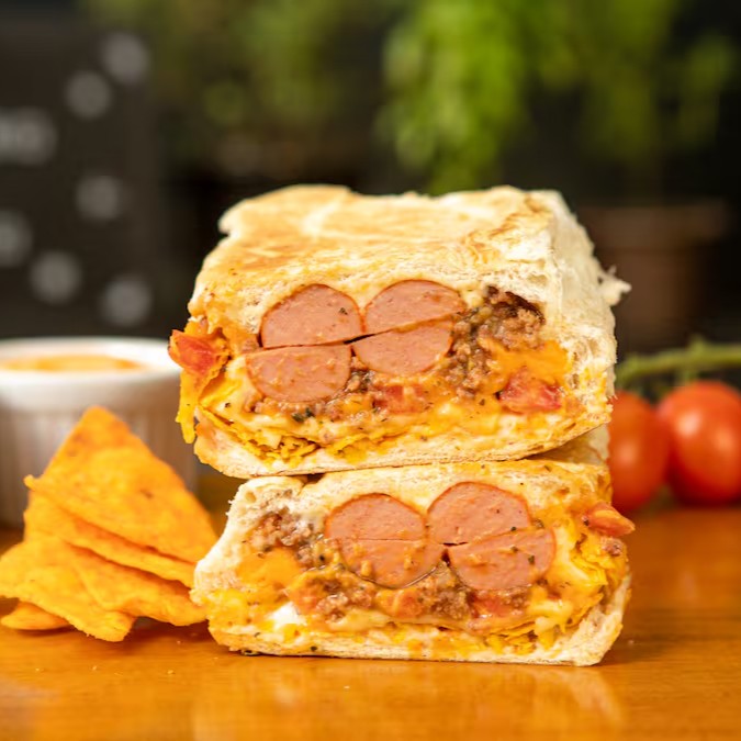 Prensado de pão, 2 vinas, maionese, chilli de carne com feijão, Doritos, vinagrete de tomate, cheddar e mussarela.