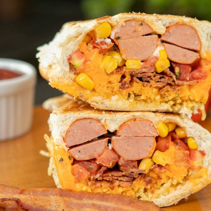 Prensado de pão, vina, bacon, maionese, vinagrete de tomate, milho, batata palha e uma opção de queijo a sua escolha.