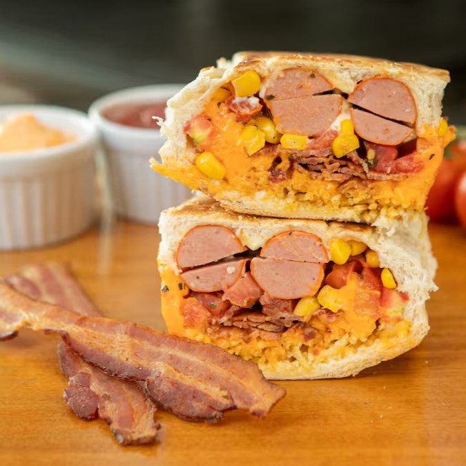 Pão prensado, 2 vinas, maionese, fatias de bacon, milho, vinagrete de tomate, batata palha e uma opção de queijo a sua escolha.