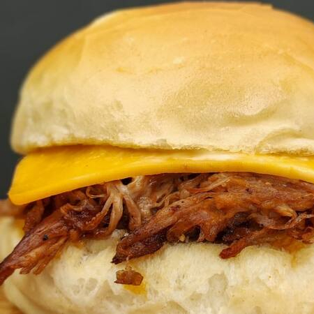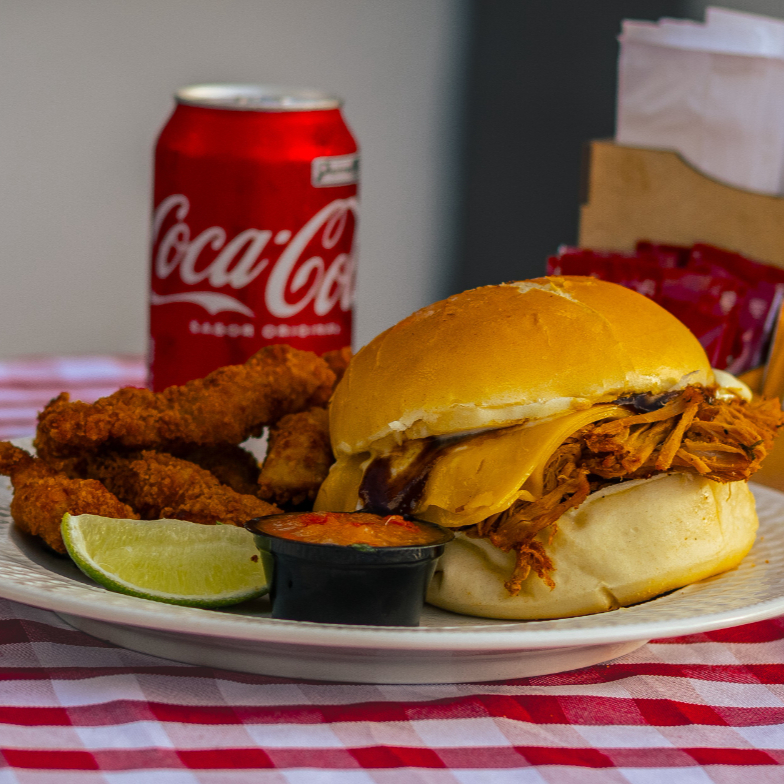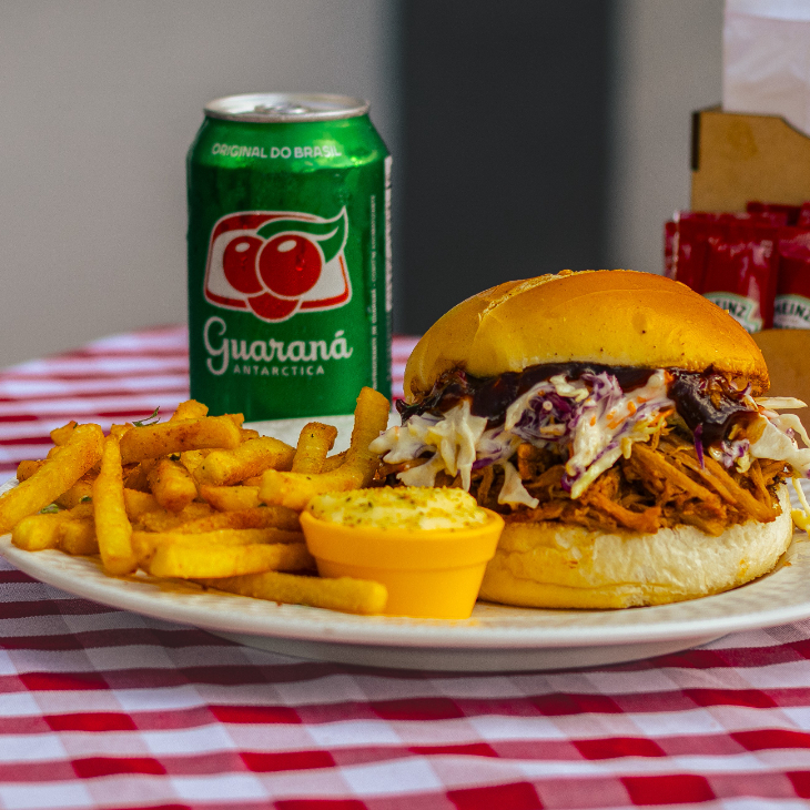 Pão, Carne e Queijo – Combo Pão macio com carne suína desfiada (copa lombo) bem suculenta, queijo mussarela, um toque de barbecue e maionese da casa. Simples, direto e cheio de sabor. No combo, acompanha iscas empanadas (frango ou porco) + bebida