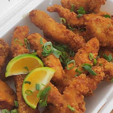 Porção de tiras de frango (filé de peito) em uma marinada espetacular, empanadas com Farinha Panko e fritas. Aproximadamente, 350g.