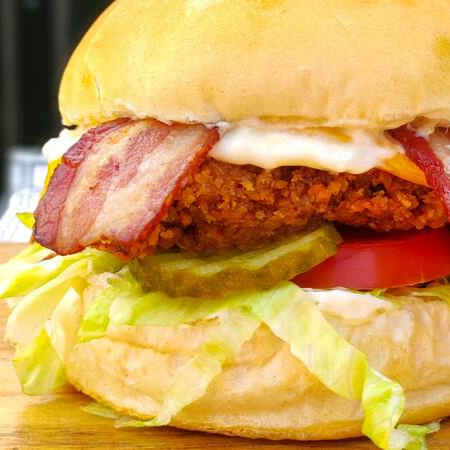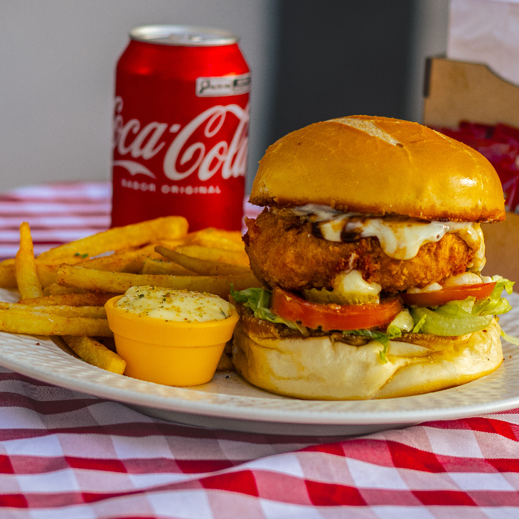 Servido em um pão crocante com maionese caseira, alface americana, tomate e picles, a carne é empanada na farinha Panko e frita mais Queijo Prato e Bacon. Aquele que não tem erro, sabe? Não gosta de salada? Sinaliza a gente nas observações, tiramos! Serve 1 pessoa