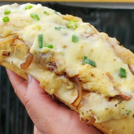 Pão baguete, maionese da casa, mignon suíno em cubos, cebola e milho feitos na chapa, requeijão cremoso, tudo isso coberto com queijo mussarela e finalizado com cheiro-verde. Um sanduíche caprichado, cheio de sabor e carinho em cada detalhe. No combo, acompanha iscas empanadas (frango ou porco) + bebida — porque esse aqui é divino do começo ao fim 💛🧀🥤