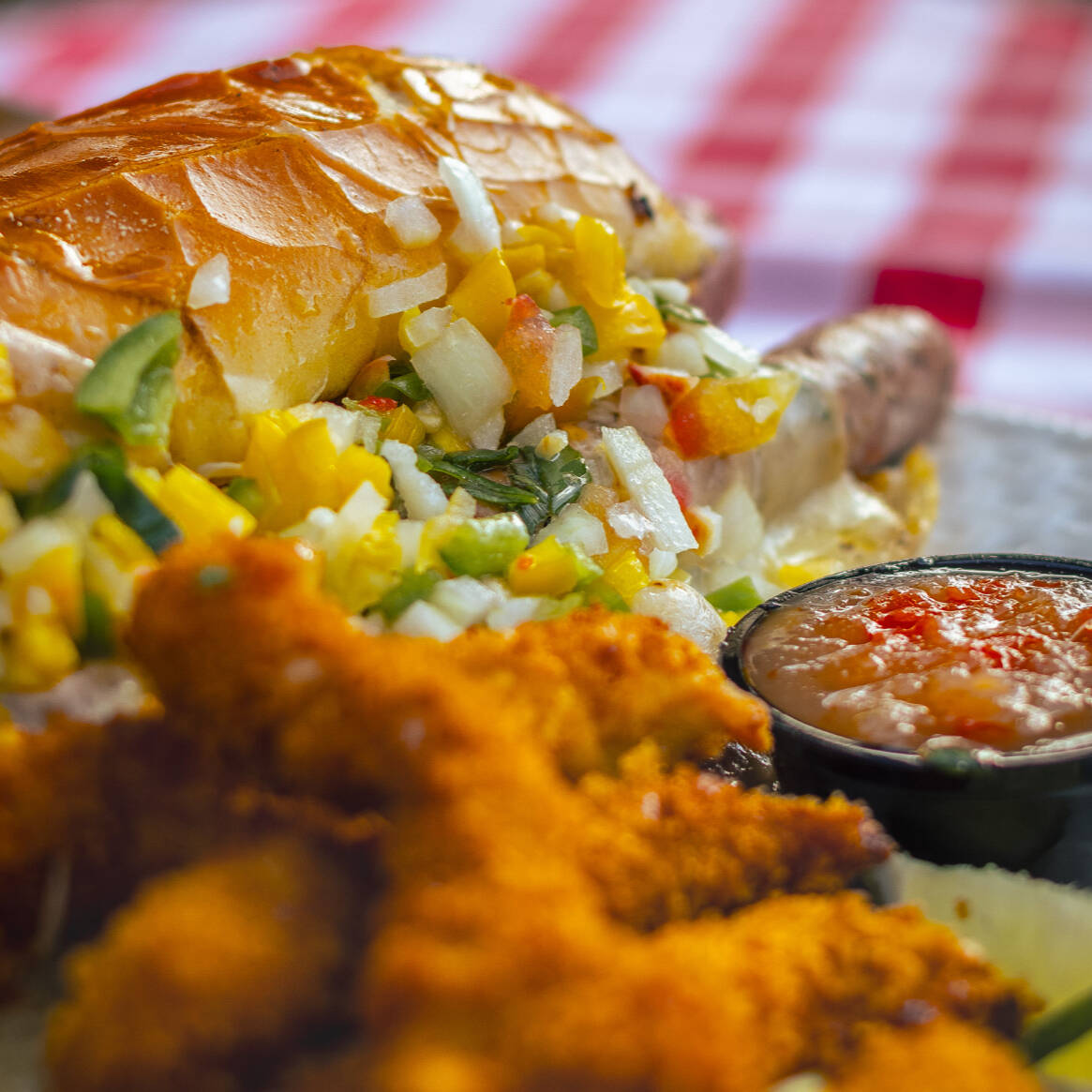 O Choripan mais brasileiro & delicioso. Pão baguetinho, maionese caseira, linguiça fininha especial (cortadinha), queijo mussarela e vinagrete de maçã. Serve 1 pessoa