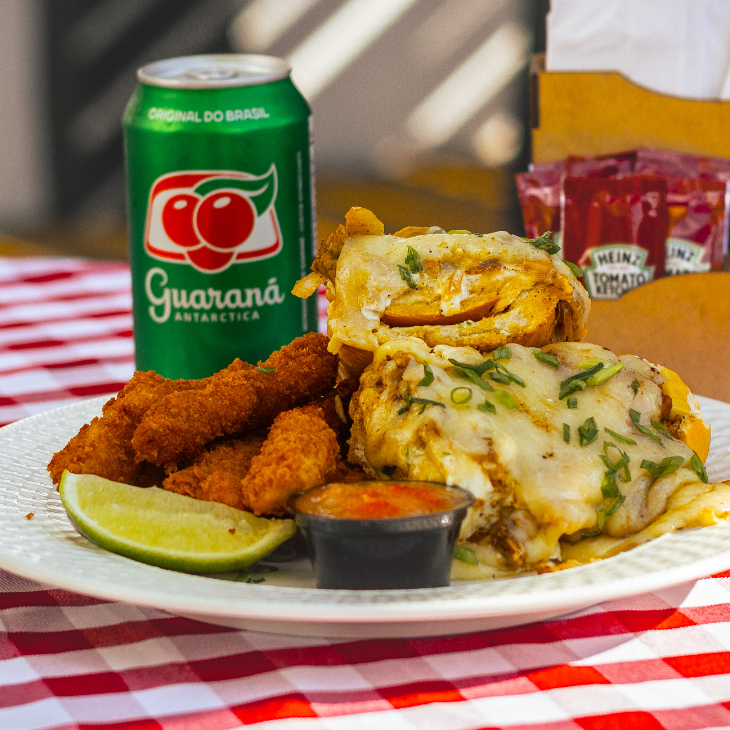 Pão baguete com maionese da casa, mignon suíno em cubos, cebola e milho feitos na chapa, requeijão cremoso, tudo coberto com queijo mussarela e finalizado com cheiro-verde. Um lanche caprichado, intenso e muito bem servido. Acompanha batata frita (100g) + bebida. As batatas são enviadas por delivery e podem perder um pouco da crocância durante o transporte. Isso é normal.