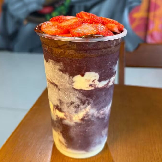 Copo de açaí de 300ml com morango, nutela, leite em pó e leite condensado.