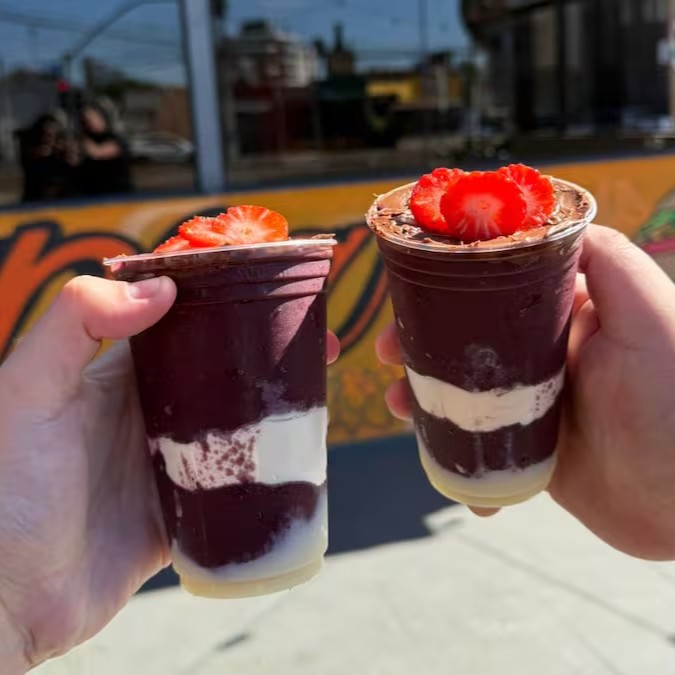 São dois copos de 300ml de açaí com morango, leite condensado, leite em pó e nutela.