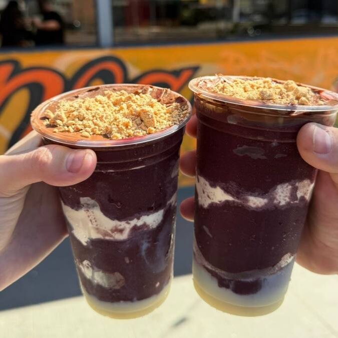 Dois copos de açaí de 700ml com paçoca, nutela, leite em pó e leite condensado.