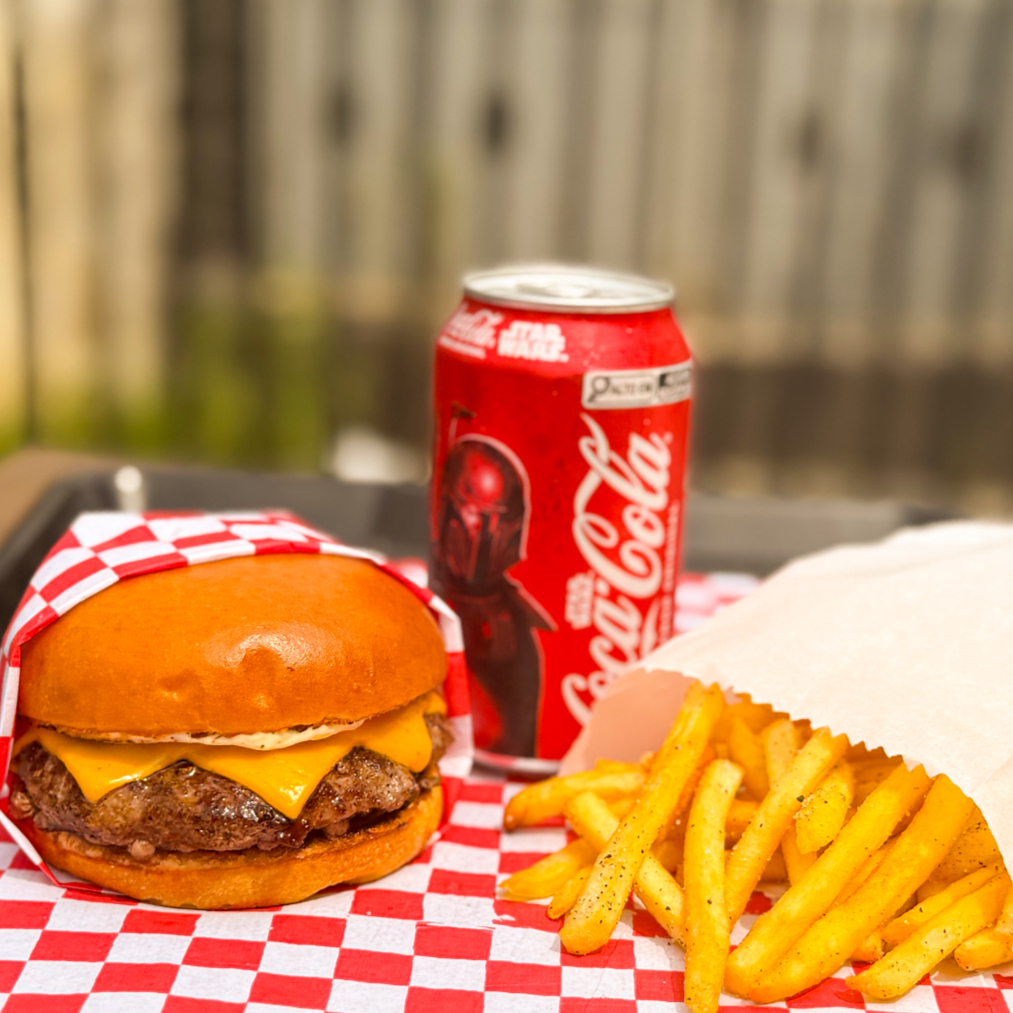Pão brioche , Smash de 90g bem selado , queijo cheddar , alface americana e tomate fresquinho pra fechar maionese verde da casa . 120g batata frita acompanha coca cola 200ml