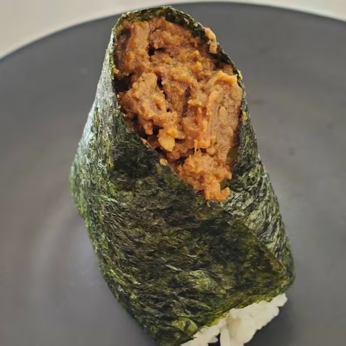 Onigiri com sabor de curry keema. Carne moída de boi e porco temperada com curry japonês. O arroz japonês, o curry doce e as especiarias formam uma combinação deliciosa que abre o apetite!