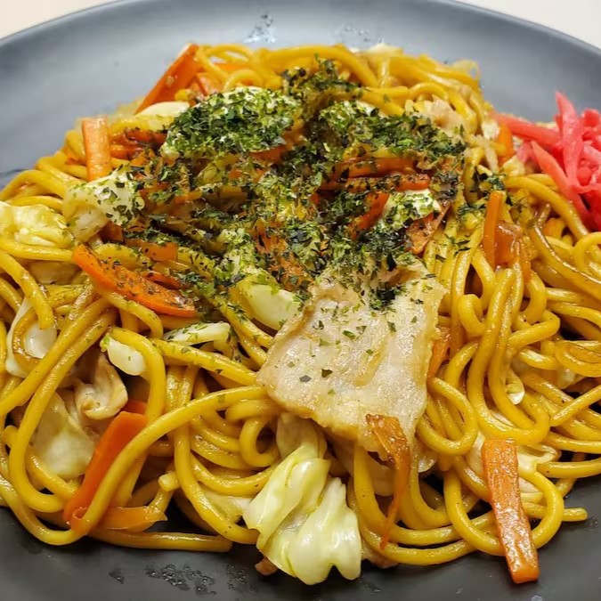 O tradicional “yakisoba “. Muito querido entre o povo japonês agora com molho caseiro especialmente preparado. (Yatai fuu). Com a combinação de macarrão cozido ao ponto para yakisoba , o repolho, a doçura da cenoura e a carne de porco frito . Resulta numa parceria inigualável!