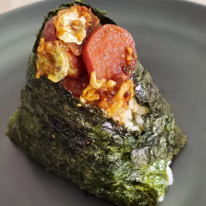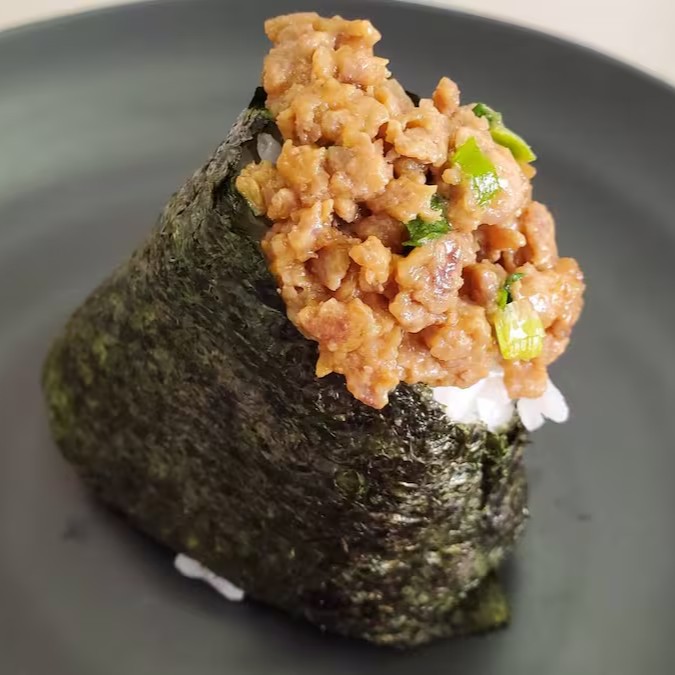 Oniguiri recheado com carne de porco moído temperado e frito com cebolinha picada,missô e mirim .