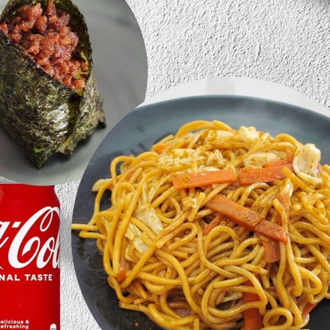 1/2 Karê Yakisoba. Um Onigiri com o sabor de sua escolha. Refrigerante Coca-Cola(Lata 350ml).