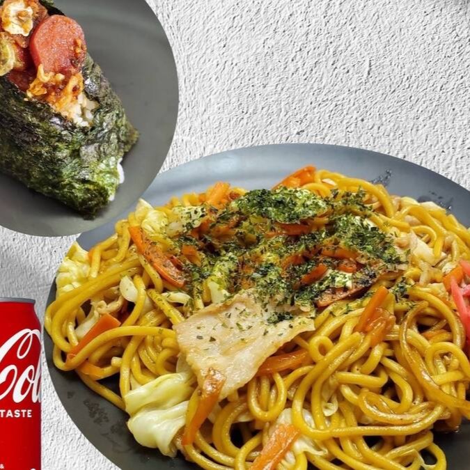 1/2 Yakisoba (molho japonês). Um Onigiri com o sabor de sua escolha. Refrigerante Coca-Cola(Lata 350ml).