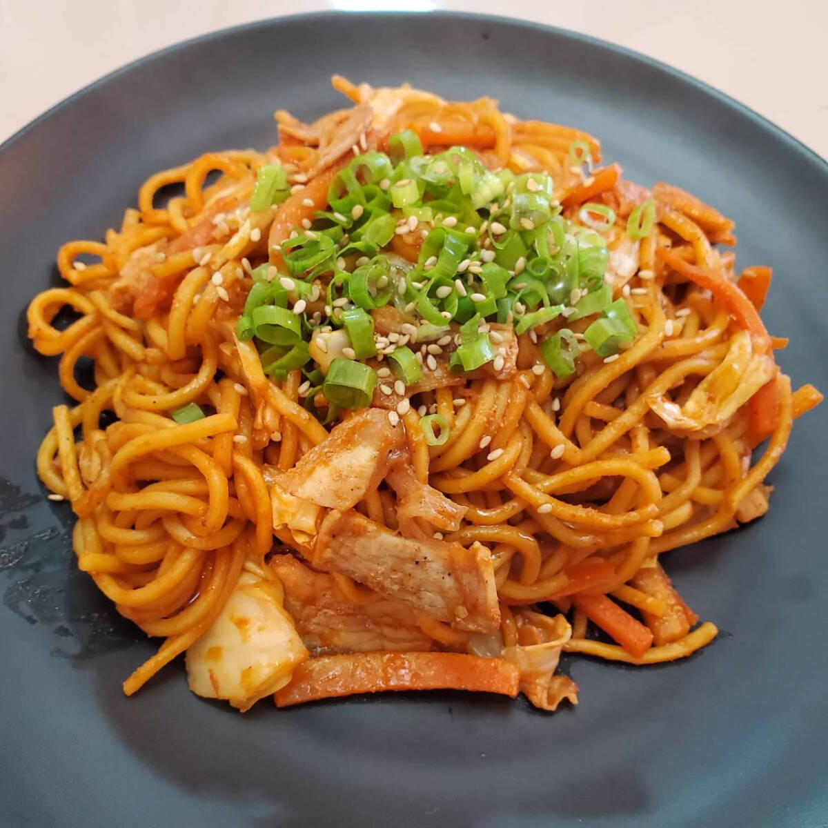 Pronto para o desafio picante? Macarrão yakisoba com carne de porco refogada, repolho e cenoura.