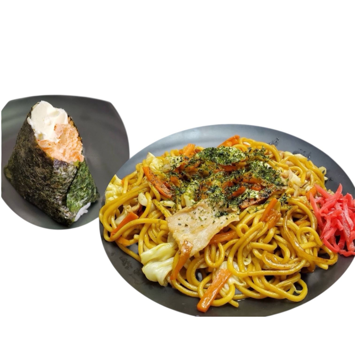 Combo com 2 Yakisoba (molho japonês) + 2 Onigiri no sabor de sua escolha.