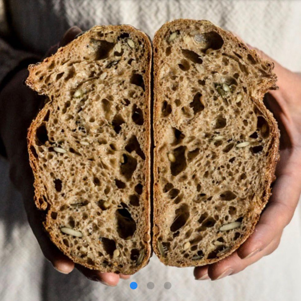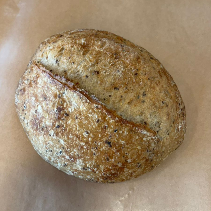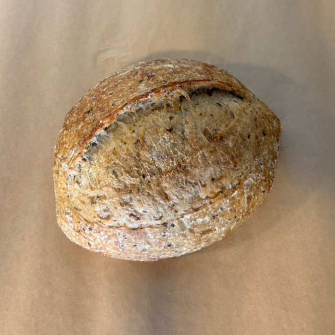 Nosso pão semi-integral de castanhas é produzido com fermentação natural (levain), respeitando o tempo da massa para desenvolver mais sabor, leveza e digestibilidade. A combinação de farinhas traz equilíbrio entre maciez e rusticidade, enquanto as castanhas adicionam crocância e um sabor levemente tostado que torna cada fatia especial. Com casca crocante e miolo macio, é perfeito para o café da manhã, para acompanhar queijos, manteiga, geleias ou até para preparar sanduíches mais sofisticados.