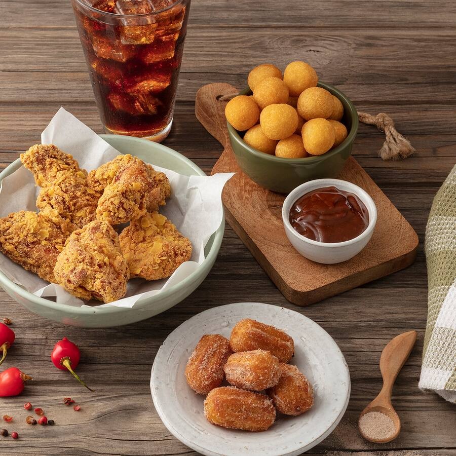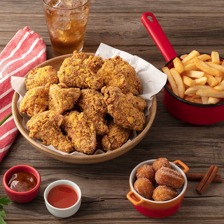 Mix de frango crocante 700 gramas + batata frita 300 gramas + 5 mini churros + Kuat 2 litros + molho barbecue e picante